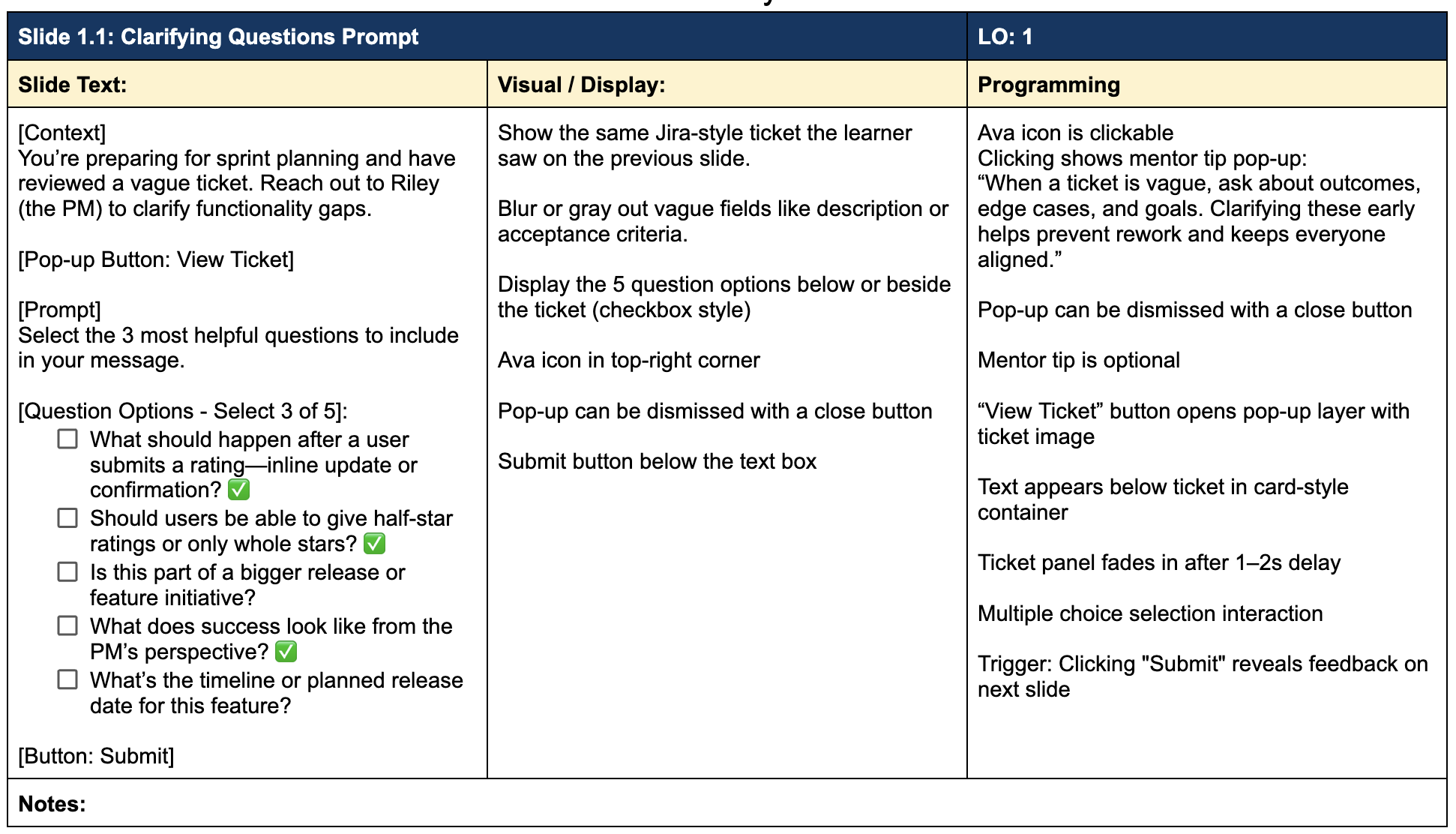 Building on the priorities established through action mapping, I used a text-based storyboard to map out dialogue, decision points, consequences, and feedback across each scenario.